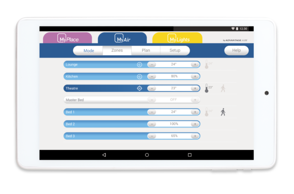 MyAir is Advantage Air’s premium reverse cycle air conditioning management system with up to 10 zones, individual room air flow control and a touchscreen that is also an Android tablet.