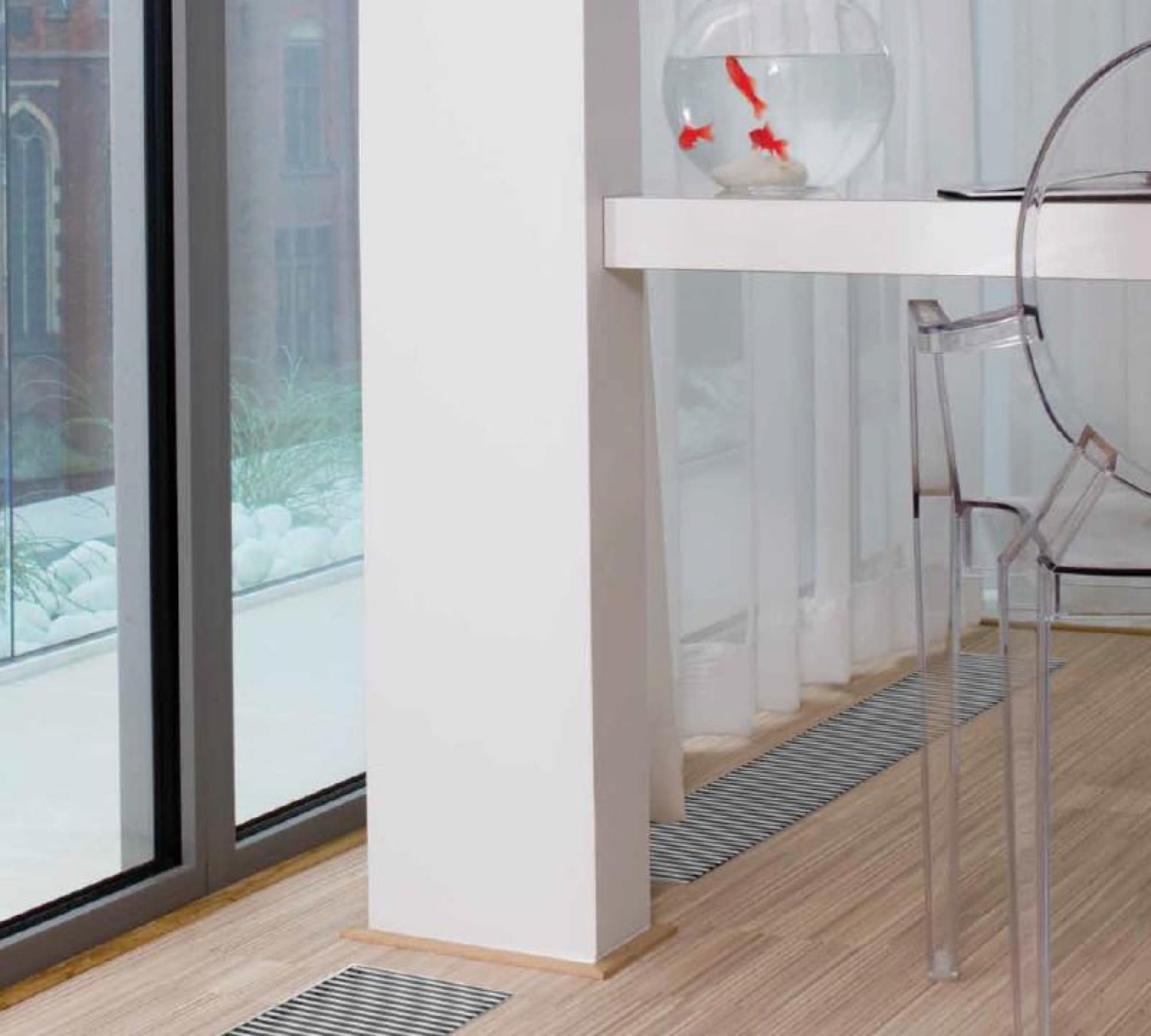 Trench heaters are a great solution for rooms with limited wall space. The trench heat exchanger is installed in a custom made enclosure in the floor and finished with a custom made floor grille. They are perfect along large glass areas where they can act as a buffer of warmth against the cold. This ensures optimal thermal efficiency without having to sacrifice above floor space as well as your view from the window.